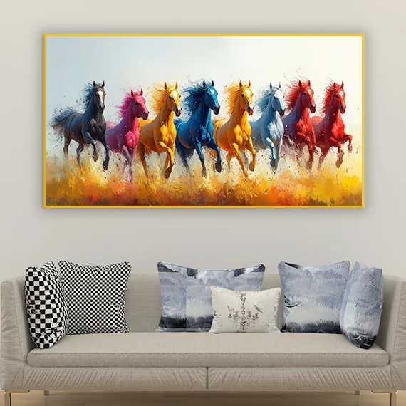 Invoke power, prosperity, and positive energy with this Seven Running Horses Canvas Wall Painting — a symbol deeply rooted in Vastu and Feng Shui. Known to bring speed, strength, and financial growth, the image of 7 horses running forward is believed to eliminate obstacles and attract success.