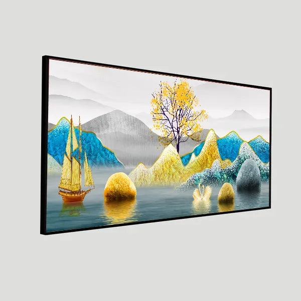 Sail into serenity with Boat in River Around Hills Canvas Art — a soothing masterpiece that captures the harmony between water, mountains, and sky. The gentle flow of the river and distant hills create a meditative balance that calms the mind. Printed in HD quality on premium 4x2 feet canvas, this artwork is ideal for living rooms, lounges, or offices. It symbolizes peace, journey, and reflection, making your wall a window to nature’s timeless beauty.
