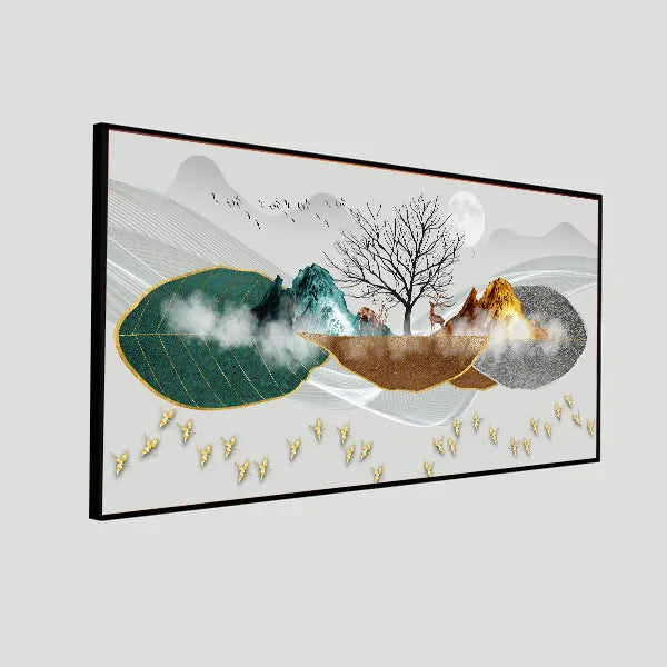 | •Framed Canvas (Floating Frame): The canvas is first wrapped and then placed inside a decorative outer frame that gives the illusion of it "floating" inside the frame. | Is the canvas painting ready to hang? | Yes, all canvas paintings come with pre-installed hanging hardware. Wrapped canvases typically have a sawtooth hanger or wire, while floating frames often include D-rings and wire for more secure mounting. |