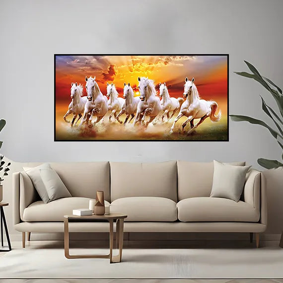 Seven white Running horses in sun rise canvas painting for living room,bedroom, office, hotel et. big size 48x24 inch ready to hang
